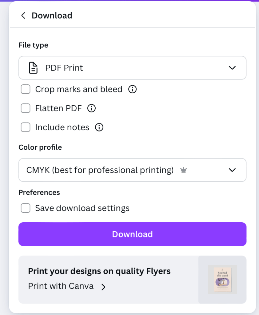 I downloaded it with CMYK color settings so that it will print at a higher quality. Canva will only let you download CMYK files as a pdf (as far as I could tell).