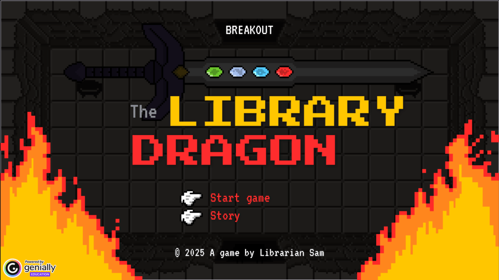 Genially was totally new to me, but I found it very intuitive! I chose a template – a game designed for the player to collect gems to power up a sword to defeat dragon.