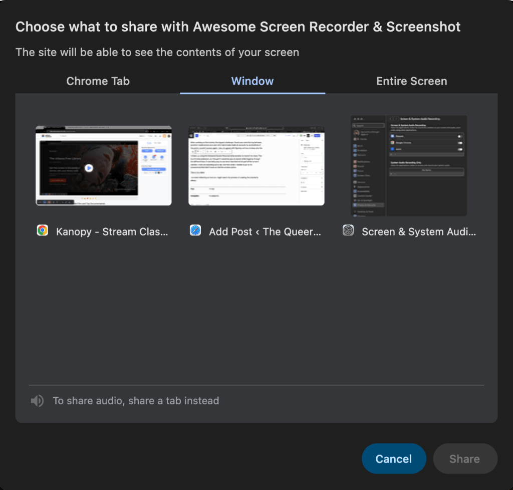 I ended up using the Awesome Screen Recorder & Screenshot to record the video. This is a Chrome extension, so I thought it would be easy to record while toggling through the different tabs. It was fairly easy to use once I decided which part of the screen I wanted. I tried out recording just a tab, but then when I needed to go to my screenshots that didn’t work so I did the window option.